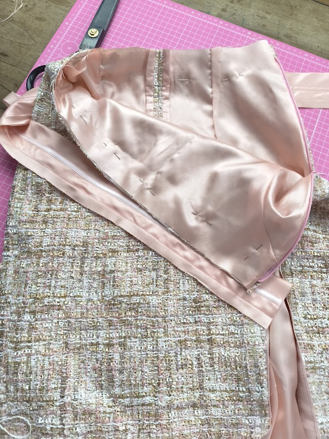 4. Tecniche di Rifinitura di Alta Moda: Trapuntatura della fodera, bordi decorativi, catenina per il bilanciamento: ogni elemento è studiato per aggiungere quel tocco di lusso che contraddistingue la giacca Chanel.
